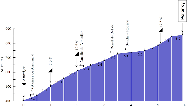 Esta subida se encuentra situada en la Sierra Espada. Desde su comienzo en Almedijar hasta coronar la cima es necesario vencer casi 6 km de subida con una pendiente media del 7.7 %. El terreno en general es bueno y muchas zonas están hormigonadas.