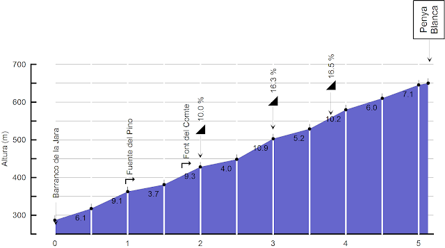 La ascensión podríamos decir que comienza cruzando el barranco de la Jara. Con terreno asfaltado nos encontramos con un primer kilómetro con una pendiente superior al 7%. Aunque se sube bien, es importante no cebarse en vistas de lo que falta. Pasado el cruce que nos llevará hacia Argines y la Font del Pi el terreno se suaviza y además continúa asfaltado hasta la Font del Comte.