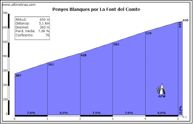 Situada en la cara norte de la Sierra Calderona, la ascensión a Penyes Blanque no es solamente dura debido a sus rampas si no que el estado del terreno es lo que más dificulta alcanzar la cima. Debido a ello, el coeficiente APM obtenido no refleja realmente la dureza de la ascensión.